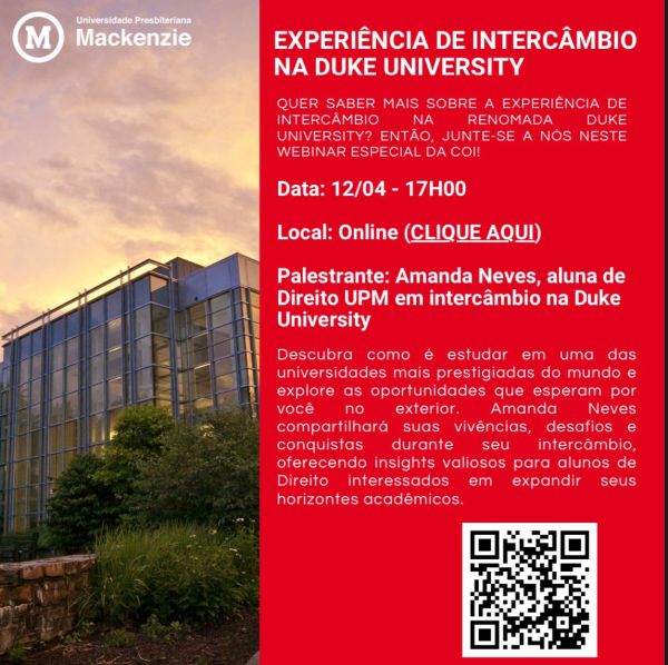 A Universidade Presbiteriana Mackenzie irá realizar um Webinar para divulgar todas as informações referentes a oportunidade de intercâmbio para alunos de Direito na Universidade Duke localizada na Carolina do Norte nos Estados Unidos. Descubra como é estudar em uma das universidades mais prestigiadas do mundo e explore as oportunidades que te esperam no exterior. Amanda... Continuar Lendo →