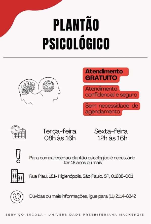 O Serviço Escola de Psicologia do Mackenzie, vinculado ao Curso de Psicologia do Centro de Ciências Biológicas e da Saúde (CCBS) da Universidade Presbiteriana Mackenzie (UPM), está oferecendo horários livres no Plantão Psicológico para atendimento gratuito. Para acessar o serviço ou caso tenha alguma dúvida, basta camparecer ao endereço Rua Piauí, 181 – 2ª andar... Continuar Lendo →
