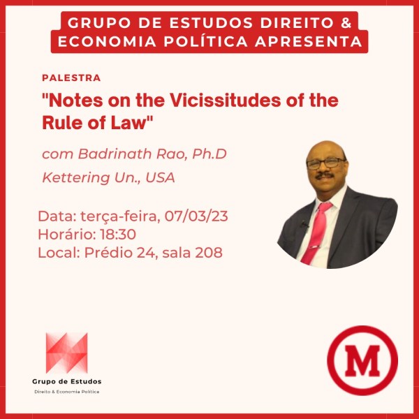 O Grupo de Estudos de Direito & Economia Política apresenta a palestra “Notes on the Vicissitudes of the Rule of Law”, com a presença do ilustre Badrinath Rao, Ph.D Kettering Un., USA. A Palestra será realizada na terça-feira (07/03/2023), às 18h30, na sala 208 do Prédio 24. As inscrições para a palestra devem ser realizadas... Continuar Lendo →