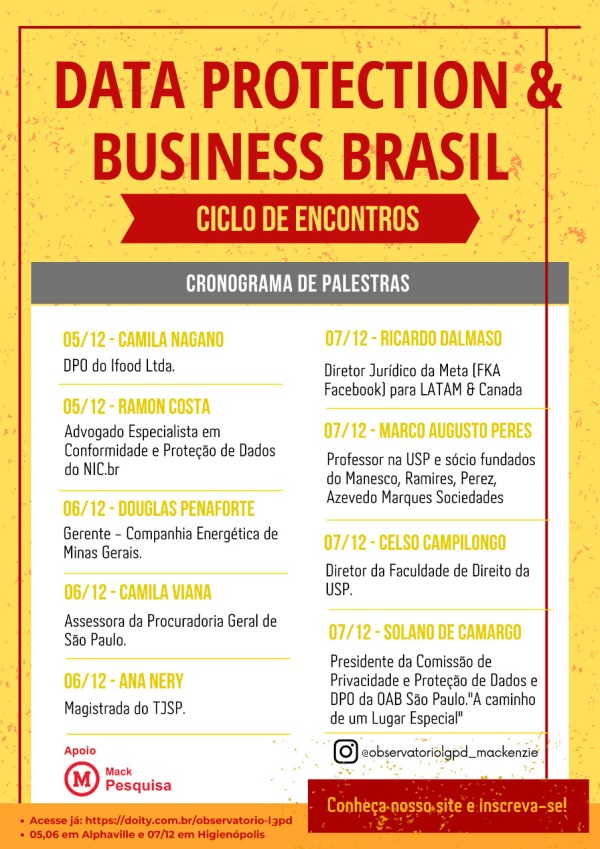 O primeiro ciclo de encontros do Observatório Data Protection & Business Brasil, vinculado à Faculdade de Direito da Universidade Presbiteriana Mackenzie, com apoio do Fundo Mackenzie de Pesquisa e Inovação, ocorrerá nos dias 5, 6 e 7 de dezembro de 2022, no período noturno (19:00 - 22:00), e contará com a participação de pesquisadores especializados... Continuar Lendo →