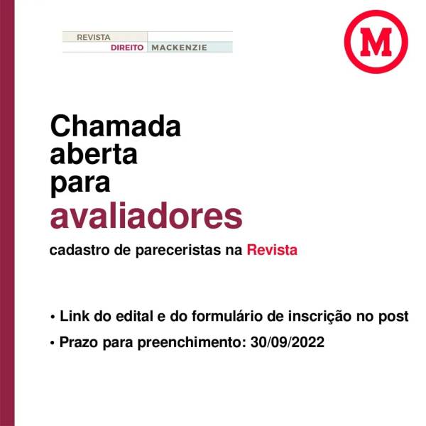 Está aberta nova chamada para avaliadores da Revista Direito Mackenzie! A Revista Direito Mackenzie, buscando ampliar sua equipe editorial e diversificar seu perfil, convida pesquisadores e pesquisadoras com título de doutorado do Brasil e exterior para atuarem como pareceristas ad hoc. De forma coincidente às Áreas de Concentração do Programa de Pós-Graduação Stricto Sensu em... Continuar Lendo →