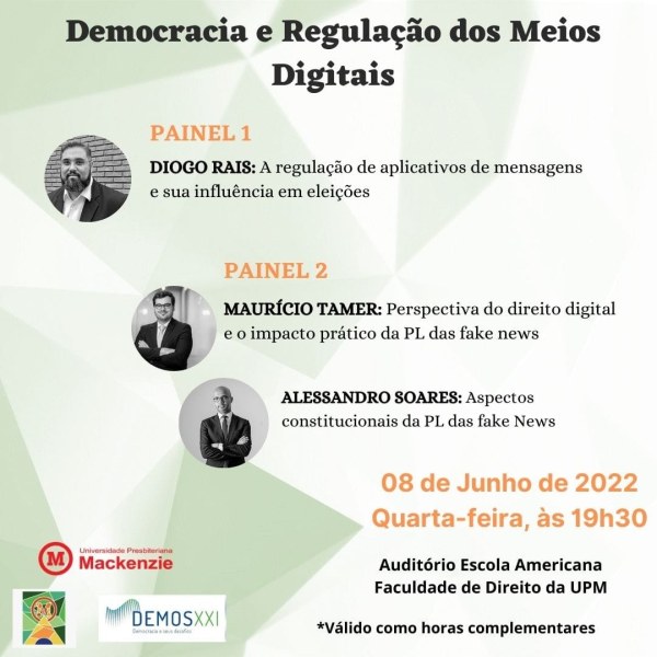 Hoje, dia 08 de junho de 2022, no período noturno, a Faculdade de Direito juntamente com o Grupo de Pesquisa Democracia e seus Desafios no Século XXI e LAE Ciência Política e Democracia em Pauta, realizarão o evento Democracia e Regulação dos Meios Digitais, que ocorrerá no auditório da Escola Americana. Os discentes que comparecerem... Continuar Lendo →