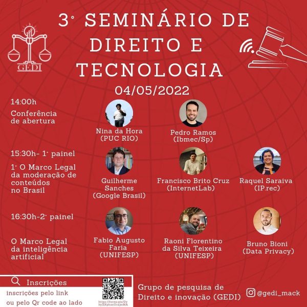 Nesta quarta-feira (04/05/2022), ocorrerá o Terceiro Seminário de Direito e Tecnologia, promovido pelo GEDI, grupo de estudos da Faculdade de Direito da Universidade Presbiteriana Mackenzie. O evento terá início às 14:00 e último painel previsto para 16:30. As inscrições estão disponíveis via QR code da foto em anexo ao site ou em: forms.gle/DybyXKphanUrajmMA. O evento... Continuar Lendo →