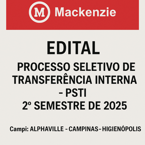 Mackenzie divulga Edital do Processo Seletivo de Transferência Interna (PSTI) para o 2º semestre de 2025 A Universidade Presbiteriana Mackenzie (UPM) publicou nesta terça-feira (17) o Edital do Processo Seletivo de Transferência Interna (PSTI) referente ao 2º semestre de 2025. O processo é voltado aos alunos regularmente matriculados que desejam realizar transferência de campus, período... Continuar Lendo →