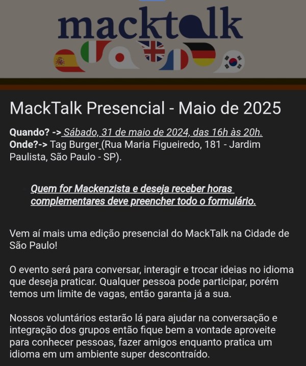 No dia 31/05, sábado às 16 horas, irá ocorrer mais uma vez o evento MackTalk, evento voltado para conversar e interagir no idioma que o participante desejar praticar! A participação é livre para quem quiser participar! O evento ocorrerá: Tag Burger (Rua Maria Figueiredo, 181 – Jardim Paulista, São Paulo – SP), terá período de... Continuar Lendo →