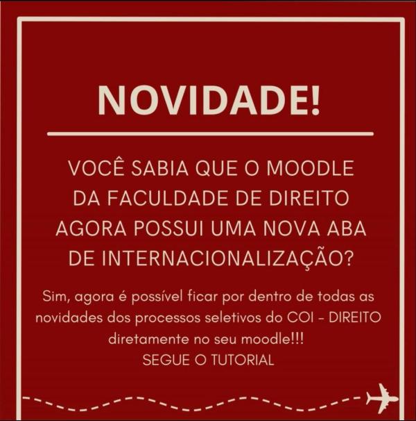 Atenção, alunos! O sistema Moodle da Faculdade de Direito da Universidade Presbiteriana Mackenzie (FDIR) agora possui uma nova aba de internacionalização. Com essa novidade, os estudantes terão acesso a informações sobre processos seletivos da Cooperação Internacional e Interinstitucional do Direito (COI-DIREITO), possibilitando uma maior integração e oportunidades internacionais. Fiquem atentos e aproveitem as novas possibilidades!... Continuar Lendo →