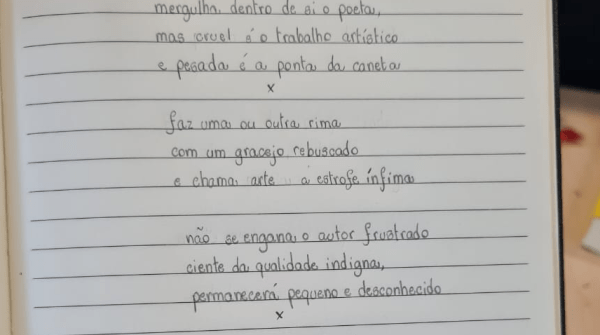 À Procura de um verso dantesco,mergulha dentro de si o poeta,vaga até o inconsciente, um becosem encontrar a palavra certa. Cruel é o trabalho artísticoe pesada é a ponta da caneta. Faz uma ou outra rima,um gracejo rebuscadoe chama “arte” a estrofe ínfima,mas não se engana o autor frustrado,ciente da qualidade indignade que permanecerá desconhecido.... Continuar Lendo →